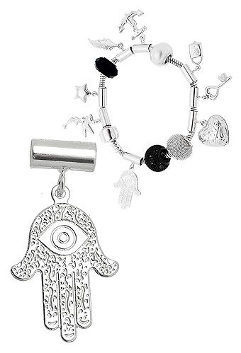 Berloque Mão de Fátima folheado a prata. Ideal para ser usado com a pulseira P358 (Pandora inspired). Este item não acompanha a pulseira.