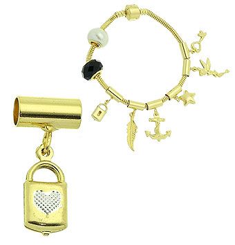 Berloque folheado a ouro em forma de um cadeado com aplique de prata. Ideal para ser usado com a pulseira P358 (Pandora inspired). Este item não acompanha a pulseira.